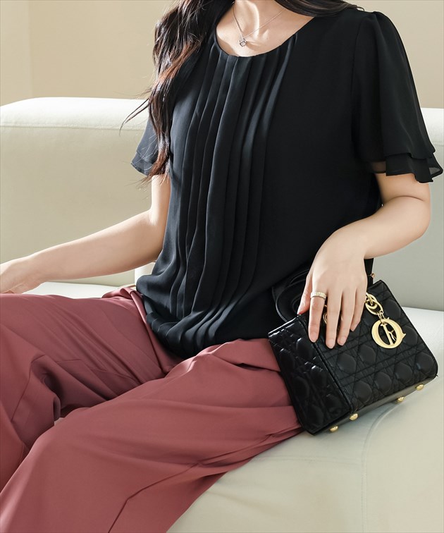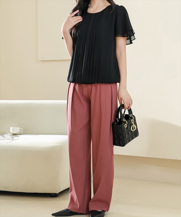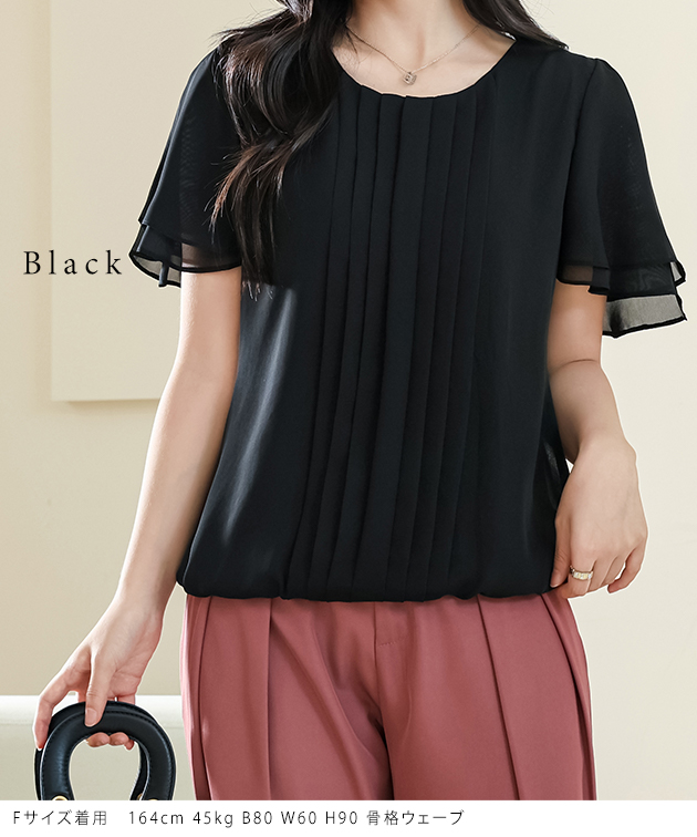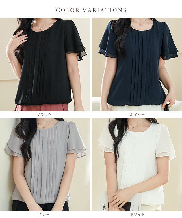 センター プリーツ ラウンドネック 半袖 シアー ブラウス 女性 レディース トップス プルオーバー 春 夏 単色 無地 透け感 シフォン