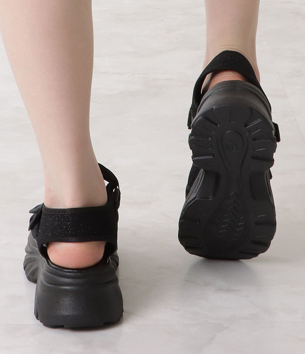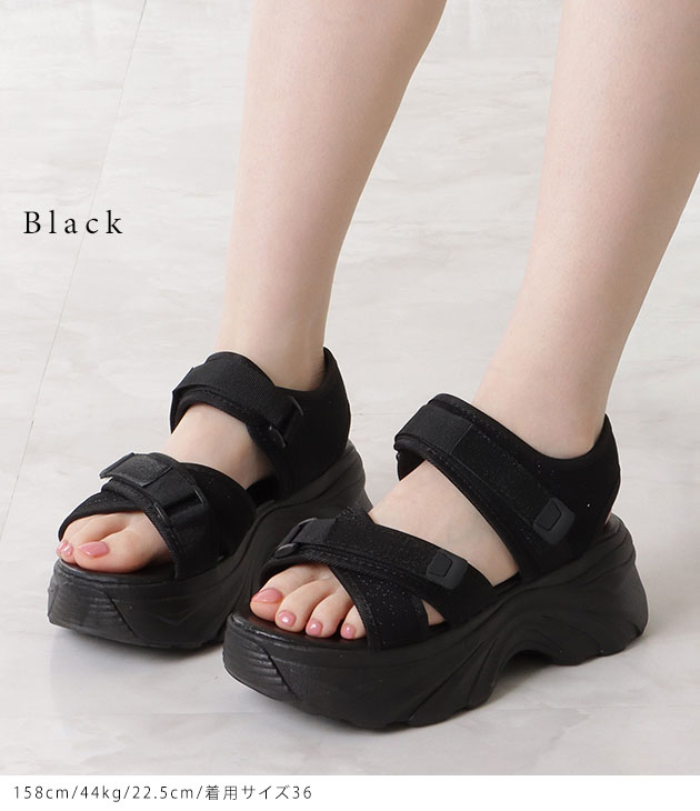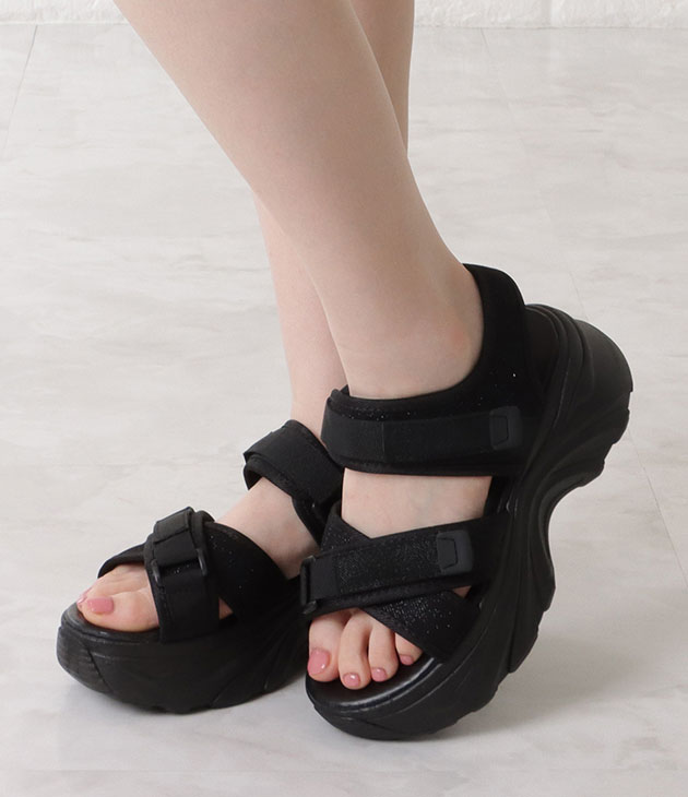 ラメ入りクロスストラップ厚底スポーツサンダル 女性 レディース ボリュームソール フラット バックストラップ ベルクロ 安定感 快適 楽ちん カジュ