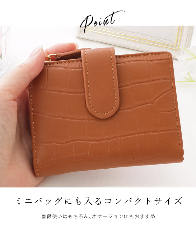 クロコ調二つ折りコンパクト財布 レディース ウォレット ミニサイズ 光沢 アニマル ワニ 合皮 フェイクレザー シンプル ミニマル 手ぶら