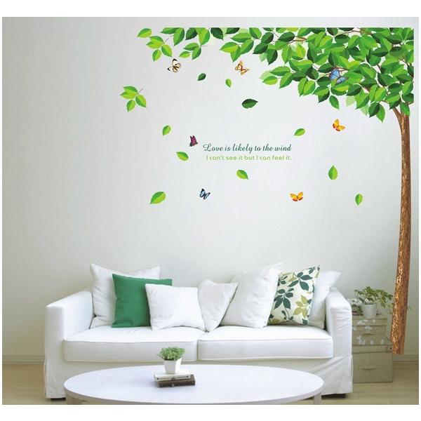 ウォールステッカー グリーンリーフの木と蝶 綺麗 はがせる 壁紙シール 緑の葉っぱ バタフライ 茶色 幹 観葉植物 自然 インテリア 賃貸可