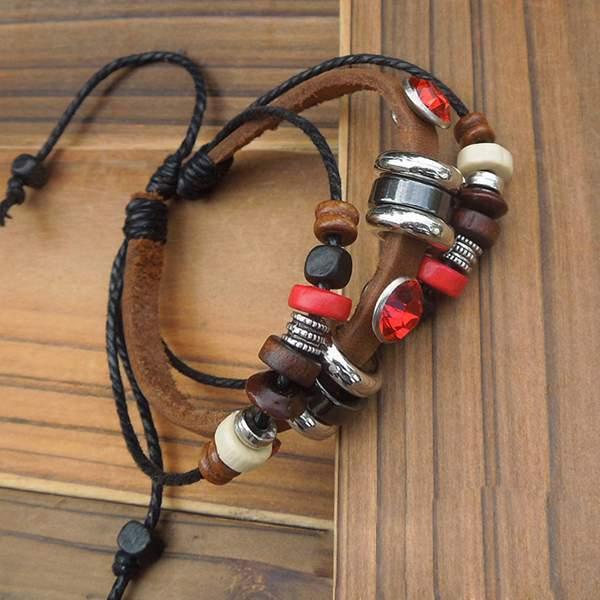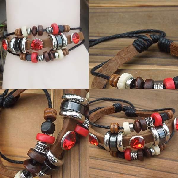 ブレスレット レザー きらきら レッド ビーズ 多重 多連 赤 茶色 重ね付け