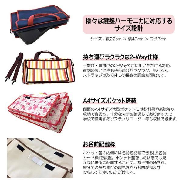 鍵盤ハーモニカに付属する「プラスチック製ケース」をそのまま収納可能なので、手提げでの持ち運びが容易になるだけでなく、ショルダーストラップを使い肩掛けスタイルで鍵盤ハーモニカを持ち運ぶことも可能になります。もちろんストラップは取り外しや長さの調節も可能です。