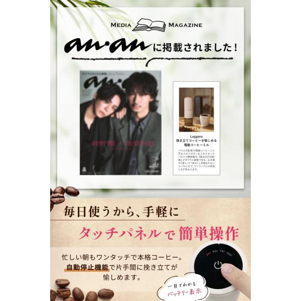【anan掲載xバリスタ監修モデル】 電動コーヒーミル コードレス コーヒーミル コニカル式 USB 充電式 水洗い可能 コーヒーグラインダー Leggero『タッチパネル簡単操作/挽き目39段階調整』