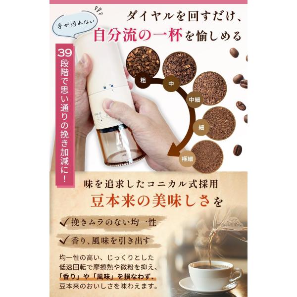 ?【自分流の一杯を】ダイヤルを回すだけで『挽き目が39段階』調整が可能。