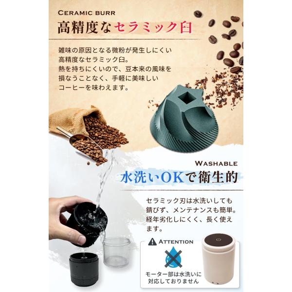 ?【お手入れしやすい】コーヒーの粉受け・セラミック臼・ホッパー部分は水洗いでき、いつでも清潔に保てます(本体のモータ―部は水洗い不可になります)