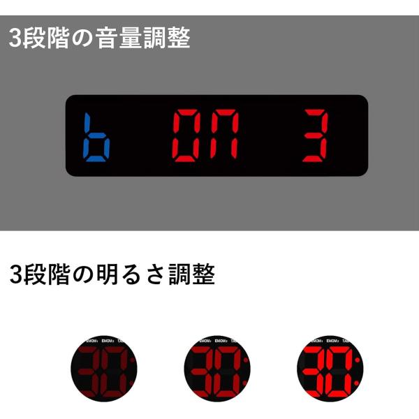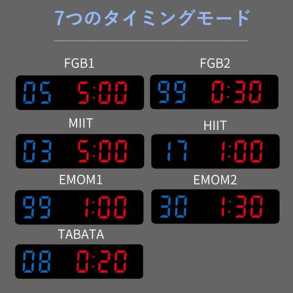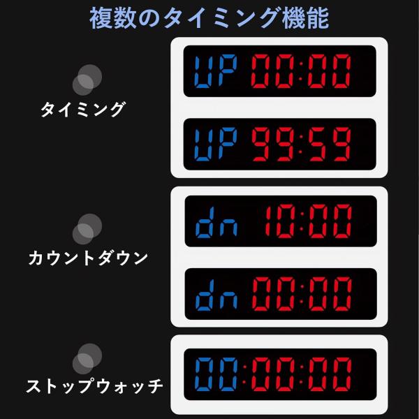 【多機能】タイマーには 時計表示、インターバルタイマーの10グループのカスタム、ラウンドごとのカウントアップ、ラウンドごとのカウントダウン、ストップウォッチ、目覚まし時計、10秒カウントダウン、ビープブザー制御など10の機能が含まれています。