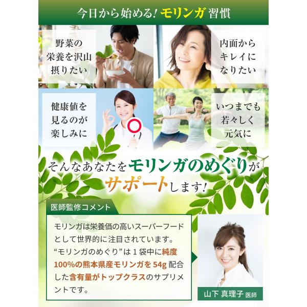 ●【医師監修】モリンガのめぐりは、活力のある毎日をサポートする完全無農薬の熊本県産モリンガ6粒で1800mg・180粒で54000mgを配合したモリンガ含有量が国内トップクラスのサプリメントです。 医師の監修を受けて規格・製造に徹底的にこだわりました。