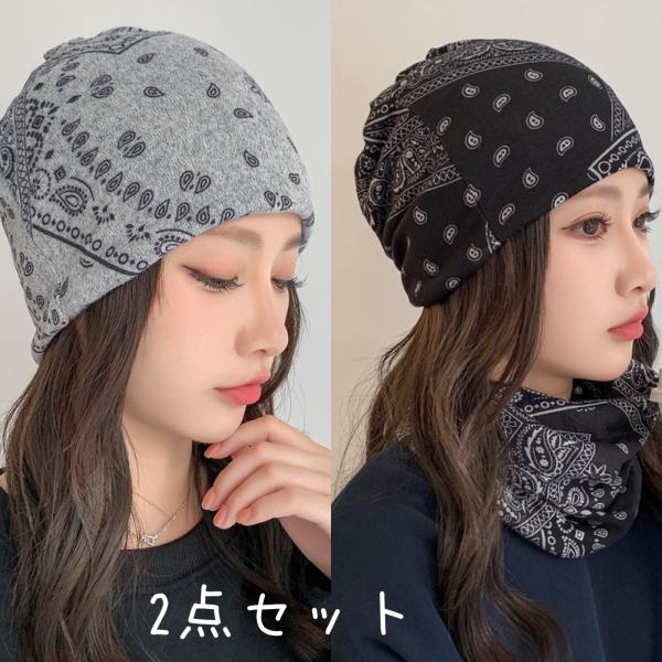 2点セット ペイズリー柄グレーとブラック 薄手3wayニット帽 医療用帽子 ケア帽子 キャップ ネックウォーマー ターバン