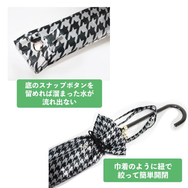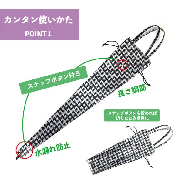 スナップボタンで長さ調節できるので、長傘はもちろん、折りたたみ傘でも使えます。