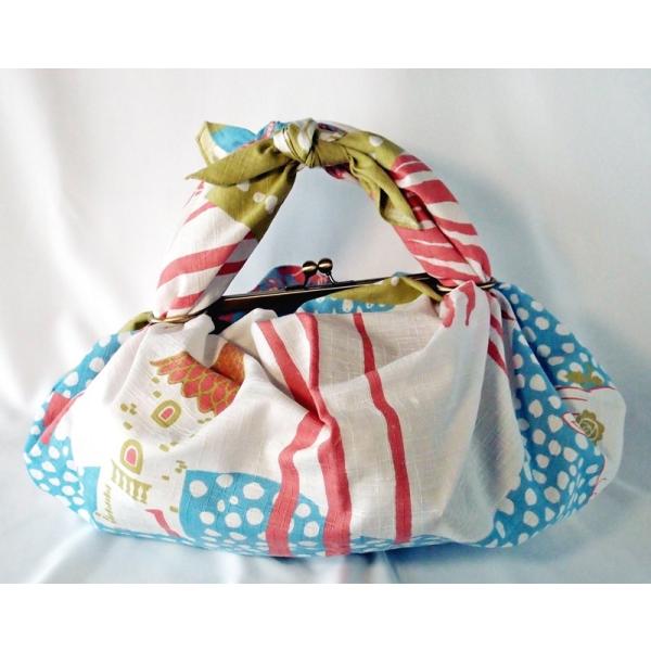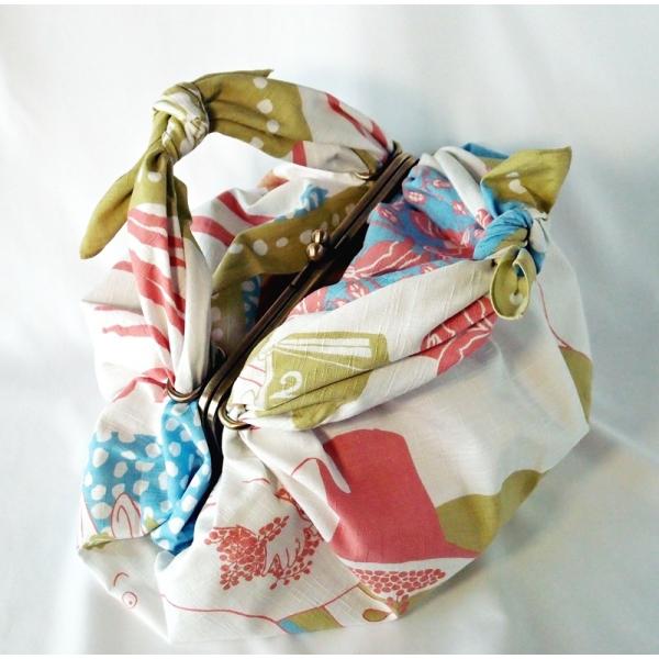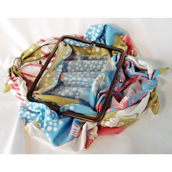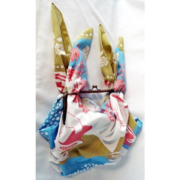 大きながま口バッグは高価ですが、大判(100cm前後)風呂敷をとっかえひっかえして気軽に楽しめます♪