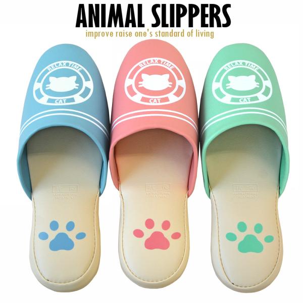 かわいいネコのマークがプリントされた抗菌スリッパ。