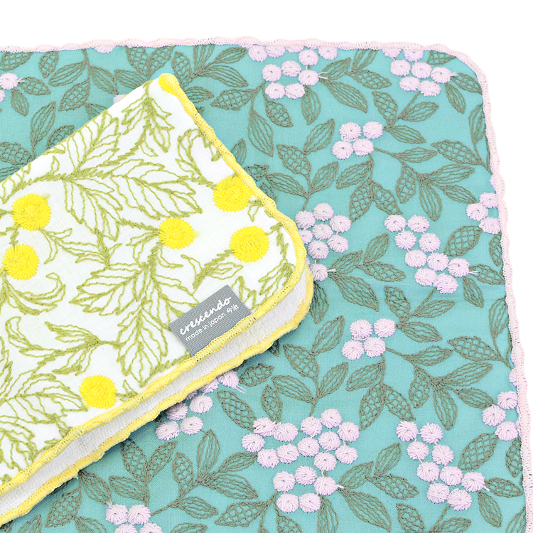 ふっくらした刺繍と丸みのあるカタチが女性らしさあふれる、手にとるたび嬉しくなるハンカチです。