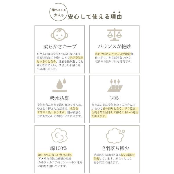 空気を含んだ糸で織られたタオルは、水分をすばやく吸い取ります。