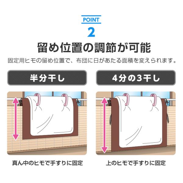 留め位置調節することで、布団に日があたる面積を変えられます。