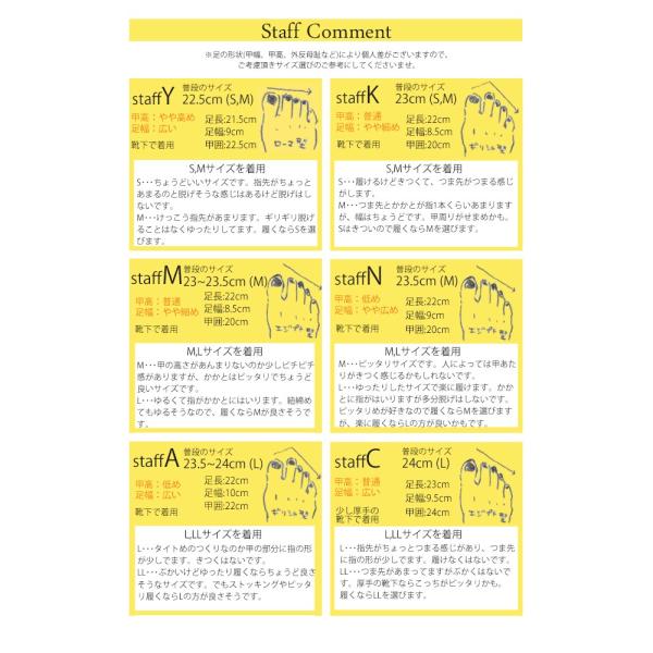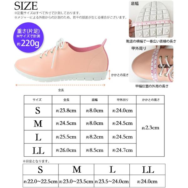 S:22.0〜22.5cm、M:23.0〜23.5cm、L:23.5〜24.0cm、LL:24.0cm
