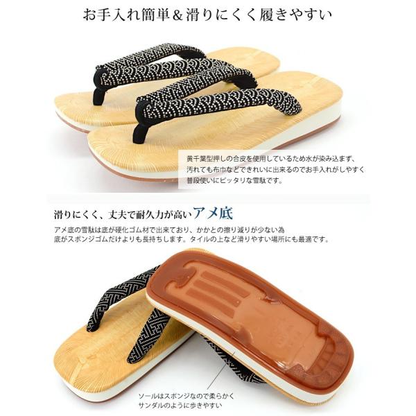 表は水が染み込まない為雨天時もご使用頂けますが、鼻緒とソールのスポンジ部分は撥水性がございませんのでご注意ください。
