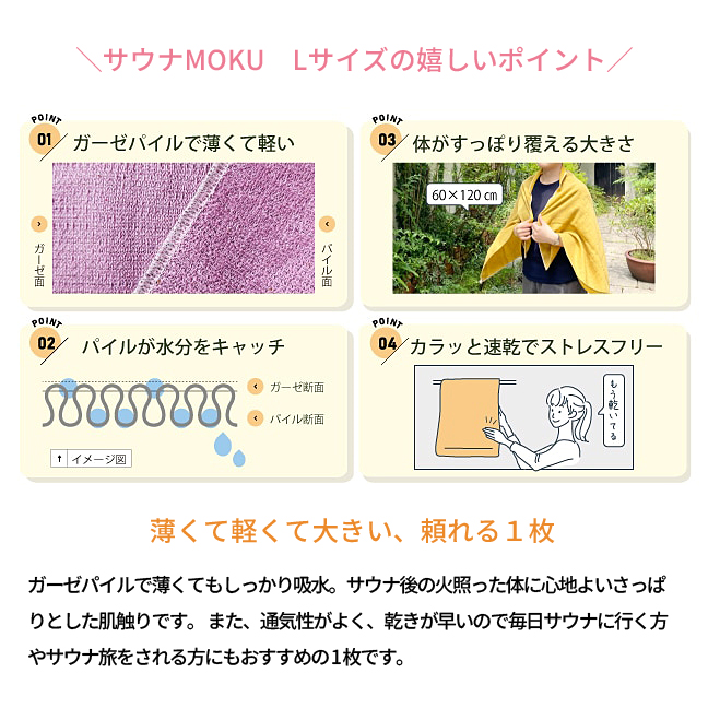 サウナタオル MOKU Lサイズ 日本製 サウナー サ活 サウナ バスタオル 軽くて 薄くて 大きい モク タオル 綿100% 速乾 アウトドア キャンプ メール便送料無料