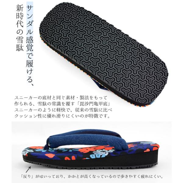 スニーカーのように軽快で、従来の雪駄に比べクッション性に優れ滑りにくいのが特徴です。