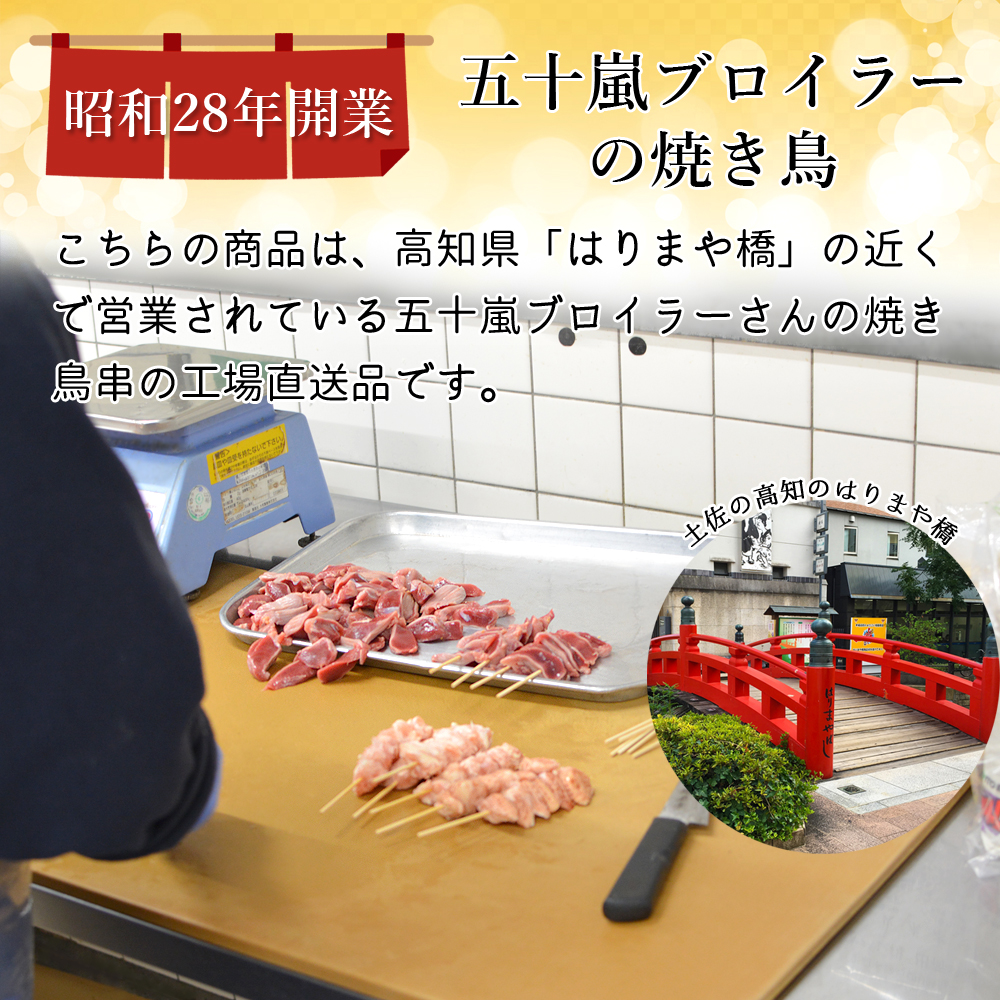 こちらの商品は、昭和28年開業の高知県は「はりまや橋」の近くで営業されている五十嵐ブロイラーさん焼き鳥串の工場直送品です。