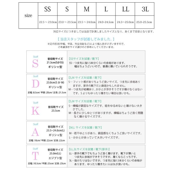 SS(22.5〜23.0cm)、S(23.0〜23.5cm)、M(23.5〜24.0cm)、L(24.0〜24.5cm)