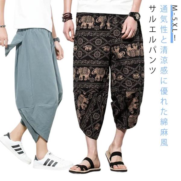 綿麻風 おしゃれ 7分丈 プリントパンツ メンズ ジョガーパンツ ゾウ 冷感 サルエルパンツ サルエルパンツ 花柄 ズボン 象柄 サルエル 春夏 カジ