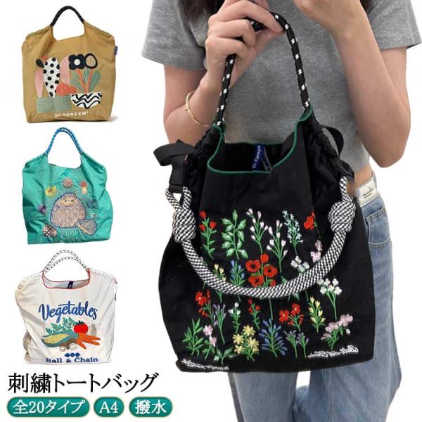 刺繍 刺繍バッグ 刺繍 肩掛け 通勤 ナイロン 軽量 A4 かわいい トートバッグ 動物 猫 花柄 エコバッグ 大きめ 買い物 ショッピングバッグ 手