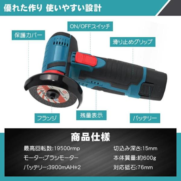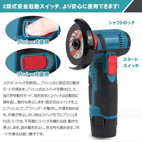 ディスクグラインダー 充電式 12V 電池/モーター増強 76mm コードレス ミニグラインダー 19500rpm 高速型 家庭用 金属切断 研磨 研削 バリ取り
