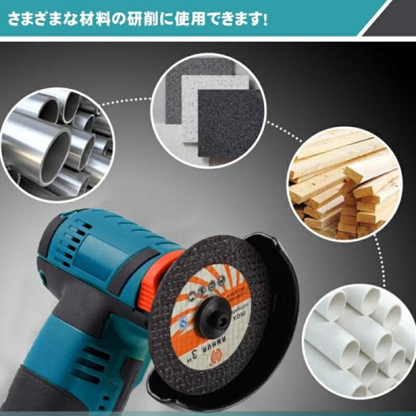 外径が76mmの砥石に対応し、最大回転速度は19500rpm、4枚の76mm作業砥石を付属し、別購入の必要がなし、金属の切断/研磨/研削、バリ取り、木材切断などに適用します(※当製品はコンクリートの切断研磨作業には適用できません)。