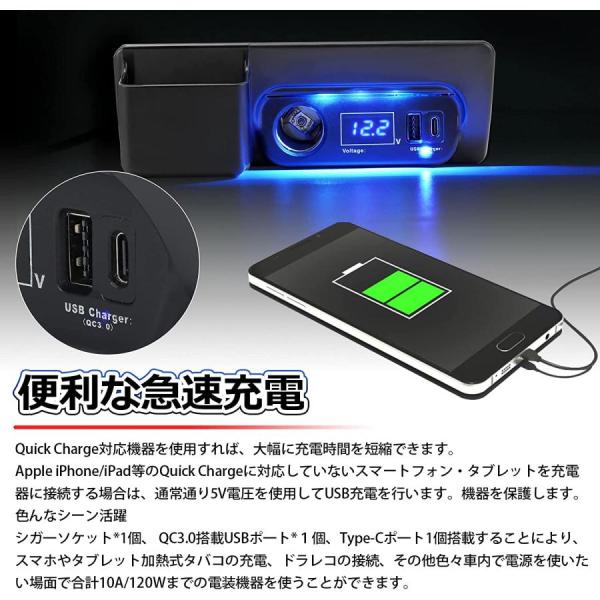 Quick Charge対応機器使用時は大幅に充電時間を短縮できます。Quick Chargeに対応していないスマートフォン・タブレットを充電器に接続する場合は、通常通り5V電圧を使用してUSBやType-C充電を行います。 シガーソケット*1個、QC3.0搭載USBポート*1個、Type-C*1個搭載することにより、合計10A/120Wまでの電装機器を使うことができます。電圧計がついているので車のバッテリーの状態がリアルタイムに分かります。