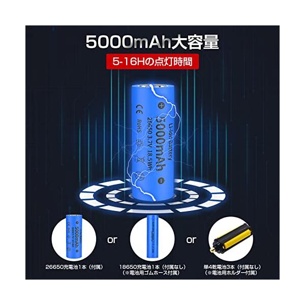 ・?製品サイズ:Φ4.1*17.2cm 重量:190g(本体) 26650 電池重量:80g 【業界最高輝度XHP160チップ+COB作業灯搭載】超高輝度のXHP160 LEDライトは使用寿命100 000時間以上に達し、周囲の暗闇を切り開き、夜間であっても昼間のように感じられます。懐中電灯の側面は追加にCOBの白い&赤いライト機能を設計し、緊急停電の時、子供用のデスクライトとして働き、家庭作業の書き込みを行うことができます。さらにストラップを付属しており、アウトドアなどの場合は手首に引っ掛けて持ち歩くこともできるので大変便利です。