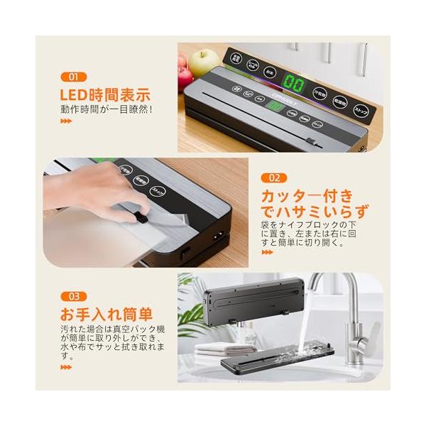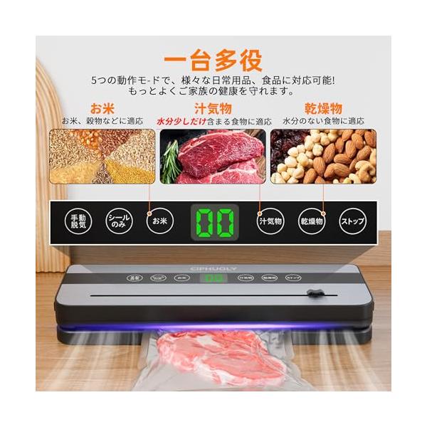 ・?【Ciphuoly 最先端の高性能真空パック機で食品の鮮度を最大9.5倍保持】Ciphuoly 真空パック 機 は、長年の研究と豊富な経験に基づき開発された5合1のフードシーラーです。手動脱気、シールのみ、お米、汁物、乾物(ドライ物)の5つのモードを搭載し、高速モーターにより約20秒で食品を効率的に真空パックします。この真空機は、適切な真空圧で食品の変形を防ぎ、雑菌の増殖を約1/50に抑制。湿気やホコリを遮断し、酸化を防ぐことで、食品の鮮度を最大9.5倍延ばし、賞味期限も大幅に延長します。さらに、30cmの延長圧着口設計により、大容量の食品も簡単に真空保存でき、複数の袋を同時に使用することが可能です。忙しい日常の中で、冷凍庫や冷蔵庫の整理が簡単になります。