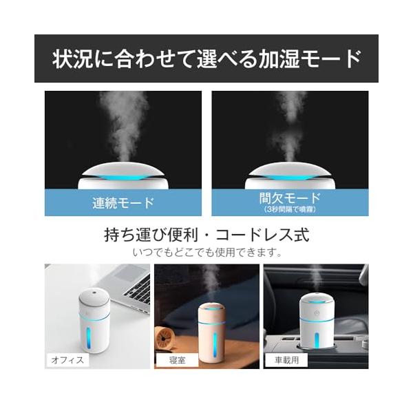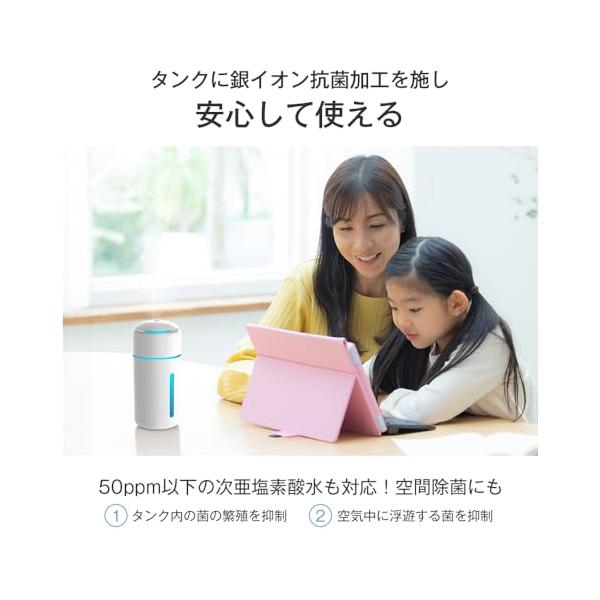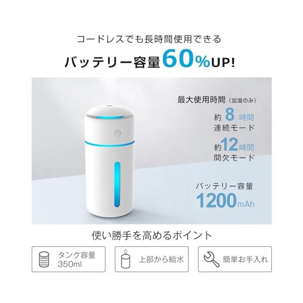 ・【バッテリー&タンク材質進化した最新モデル】旧型よりバッテリー容量が60%アップ(750mAh→1200mAh)された小型加湿器のバッテリー持続時間が2倍に! 一回フル充電して最大12H*のコードレス使用ができます。また、 加湿器 のタンクは銀イオン(Ag+)抗菌加工を施しており、タンク内の雑菌繁殖を抑え、より清潔なミストが届けます。50ppm以下の次亜塩素酸水対応した 加湿器 空間除菌にも活用できる。(※使用可能時間は使用方法、バッテリー残量、使用環境などにより大きく変動します。)