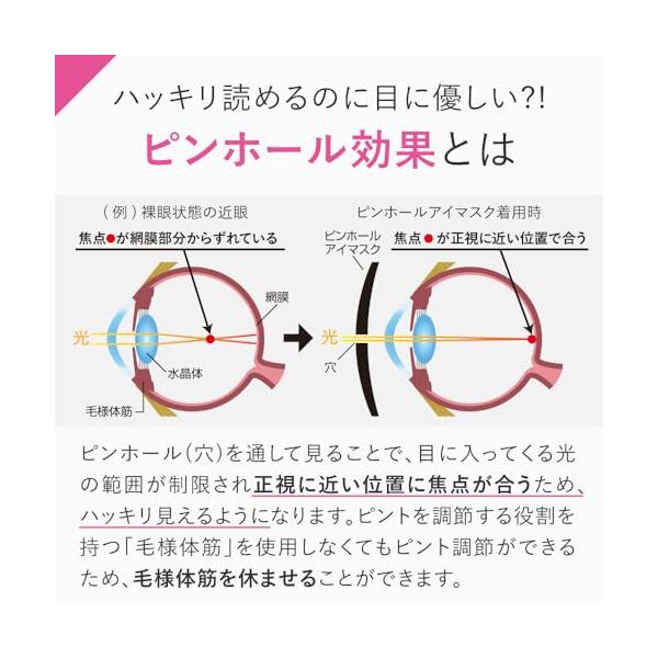 ・【ピンホール効果でストレスなく読める】仕事やスマホ、小さな文字を読む時に。作業しながら目を癒す、ピンホールアイマスク。軽くて視野が広いので、つけっぱなしでもストレスフリー。眼筋トレーニングにも。