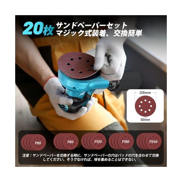 ・??【7段変速機能・20枚のサンドペーパー】6000〜13000PRM の 7 段変速機能が搭載されており、異なるギアが異なるニーズに対応することができます。20 枚のサンドペーパーが付属しており、マジックテープ式で取り付けるのが簡単です。そのため、正確な表面材料および仕事の内容に合わせて適切な速度を選ぶことができます。