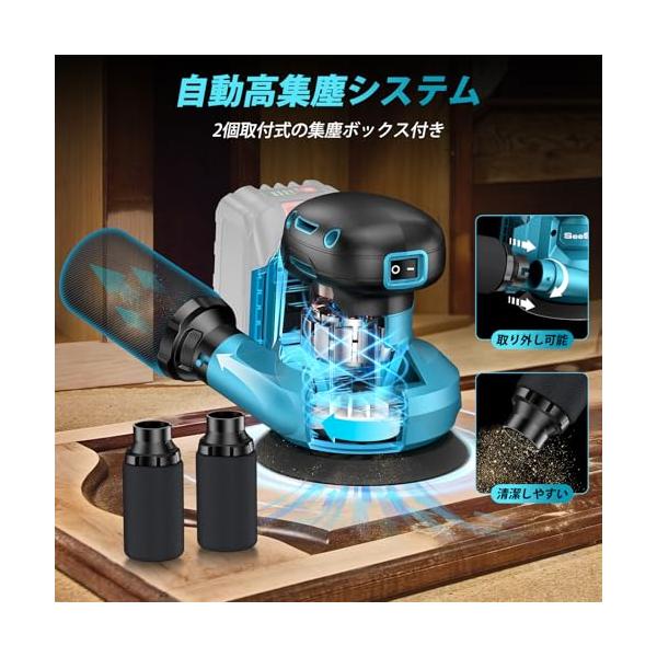 ・??【2個の着脱式集塵袋・自動集塵機能】内蔵ファンによる自動集塵機能が付いており、粉塵の片付けを簡単に行うことができます。研削面の開いた穴から粉塵を吸い込むことができ、粉塵の飛散を低減し、それをダストバッグに吸い込んで作業環境をより整然とさせることができます。2 個の着脱式集塵