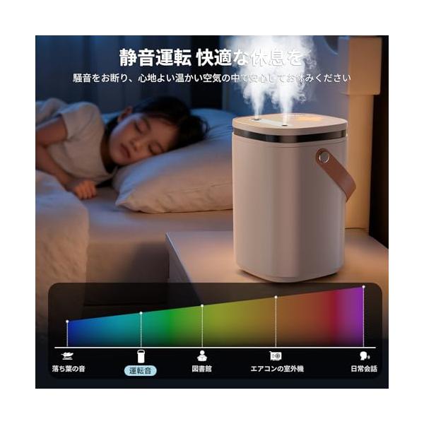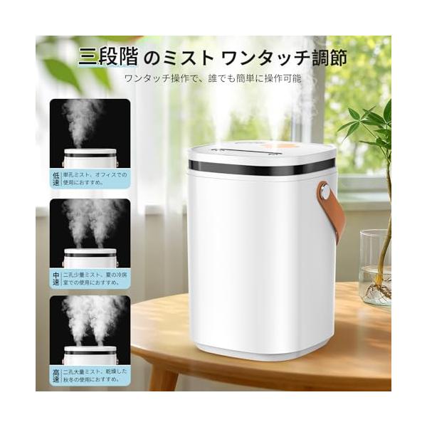 ・?【大容量2L & 3段階ミスト】卓上で使える小型加湿器の実力。この小型でコンパクトな卓上加湿器は、大容量2Lタンクを搭載。超音波式技術により、たった1回の給水で最大30時間連続運転が可能。弱モードでは夜通しの就寝中も、強モードでは広いリビングでも、頻繁な水補充の手間を大幅カット。3段階のミスト調節で、お部屋の広さや季節に合わせて「乾燥知らず」の環境をキープ。ワンタッチ操作で、誰でも簡単に操作可能。低速:単孔ミスト、オフィスでの使用におすすめ。中速:ダブル少量ミスト、夏の冷房室での使用におすすめ。高速:ダブル大量ミスト、乾燥した秋冬の使用におすすめ。