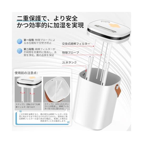 ・???【二重保護設計&安全性とクリーンなミストを両&】この超音波式加湿器は、物理プローブ搭載で、水切れ時の空焚きを自動防止。さらに綿棒フィルターが水中の微細な不純物をキャッチし、クリーンで均一なミストを安定的に噴出。ご注意:素早くミストを発生させるため、ご使用前に綿棒を水に完全に浸してください。(使用前に毎回綿棒フィルターの湿り具合を確認し、乾燥した場合は再度浸すことをお勧めします)。