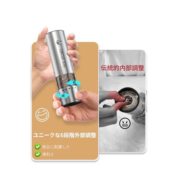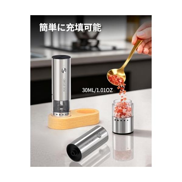 CIRCLE JOY 小型 充電式ペッパーミルセット 電動 ステンレス製ペッパーミル 厚さを外部で調整する 30ml容器 木製収納ベース 2本セ