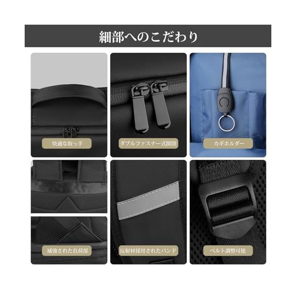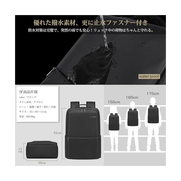 ・?【使い勝手抜群】ポケットが小さめ大きめなど多数あるので、仕分けやすく取り出しやすいです。15.6インチPCやタブレットはPC専門ポケットへ、手帳・ペン・財布などの小物はサブポケットへ、書類・A4ファイル・衣類などはメインポケットへ、折り畳み式傘・水筒はサイドポケットに入れます。日常必要なアイテムをひとまとめにして楽々に持ち運べます。メインポケットは約75度大きく開くので、スムーズに出し入れ、たくさん入るスタイリッシュであるバックパックです。