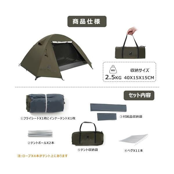 ・【設営簡単&軽量】本体重量約2.5kg。テントの軽量化が重要、構造が非常にシンプルなため、ポールには軽量・耐久性を備えた7001高強度アルミを採用。慣れていない方でも10~15分程度で組み立てできる。収納簡単1人でも収納しやすい!収納バッグ