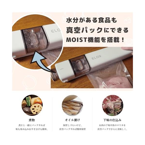 ・??【さまざまなシーンに合わせてモードを選択】スイッチを押すだけで自動で真空にしてくれる「真空モード」を搭載。この真空モードには「DRY/MOIST」の2種類が搭載し、MOISTでは水分を含む食品も真空にする事ができます。さらに真空にせずに封のみを行うシーリングモードは真空にせず、