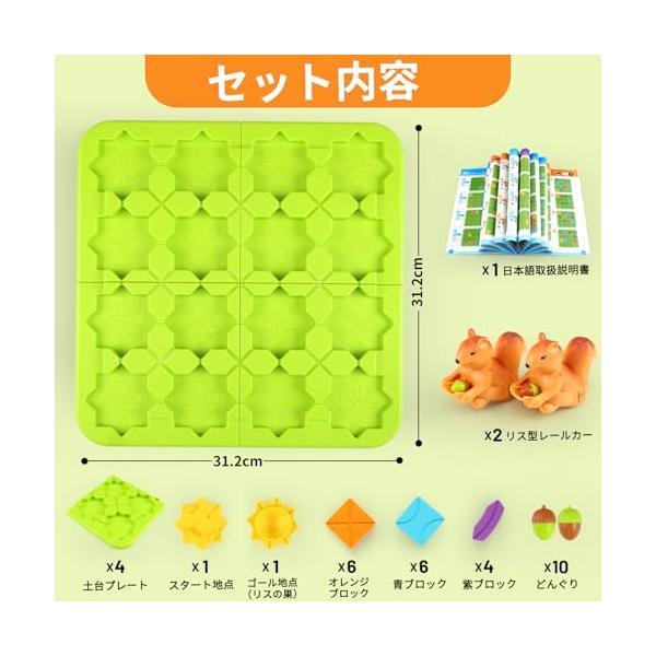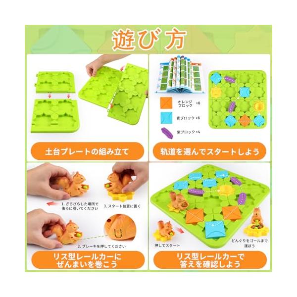 ・【ロジカルルートパズルゲーム】: ロジカルロードビルダーゲームトイは、パズル、迷路、リス型レールカーを組み合わせた知育玩具です。さまざまな種類のブロックを使って土台プレートの上にルートを設計し、 スタートからゴールまで途切れのない連続した道を作りましょう。リス型レールカーのぜんまいを巻いて、設計した道に沿って車を走らせ、どんぐりをゴール(リスの巣)まで無事に運びましょう。