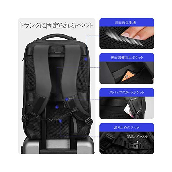 ・?【通気性】背面、ストラップ裏面はクッション材の上にメッシュ素材を使用しており、肩や背中への負担を軽減しながら、通気性に優れています。チェストベルトが装備されており、より身体にフィットする安心設計です。背面部分はスーツケースとセットアップができる構造になっており、持ち歩く便利で、出張や旅行など幅広く使用できます。特にサラリーマンの出勤は最適です。