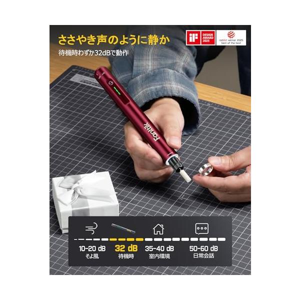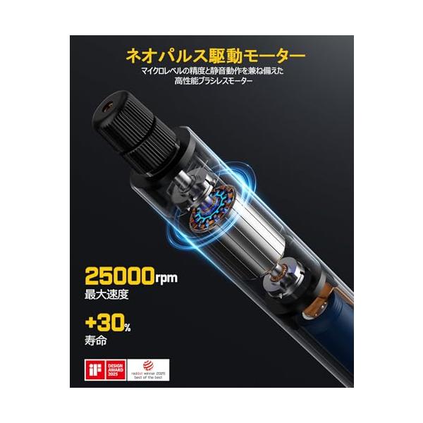 ・静音&パワフル:Fanttik F2 Masterは、ブラシレスハローカップモーターを搭載し、従来のモーターと比べて騒音を30%削減します。最大回転数は25 000RPMで、より強力なパフォーマンスと低温での運転を実現。5段階の調整可能なスピード設定で、さまざまな精密作業を簡単に扱えます