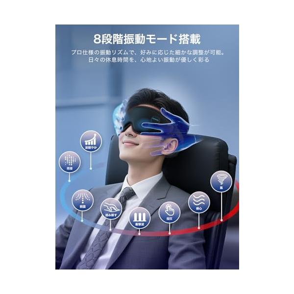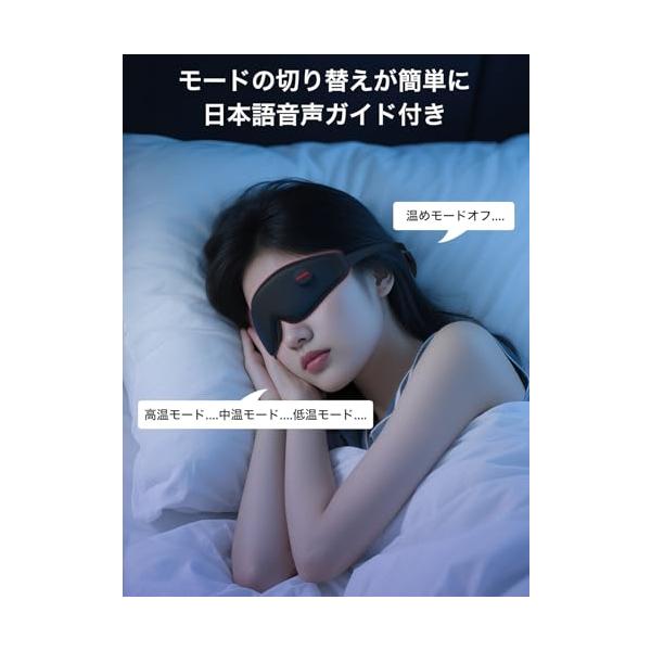 ・【温熱×振動 自由組み合わせ】三段階温度と8段階振動モードを自由に組合せ可能。4つの基本モード(温熱/振動/温熱&振動/消音安眠)に加え、好みに合わせて24通りのオリジナル設定が作成可能。日本語音声ガイドがアイマスク着用中の操作を音声でサポート