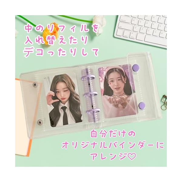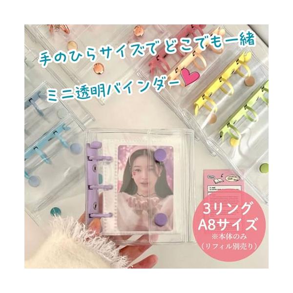 ・?【製品詳細】サイズ:約A8相当(手のひらサイズ)3穴 /カラー:全10色(クリア、クリアラメ、クリアピンク、ピンク、ホワイト、ブラック、パープル、ブルー、グリーン、イエロー)/素材:PVC(透明カバー)/セット内容:バインダー1冊