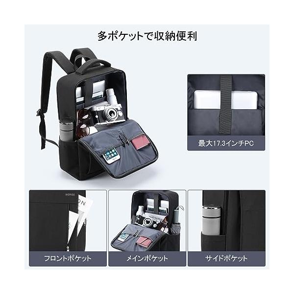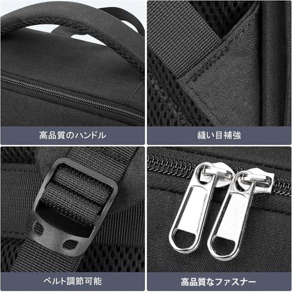・「複数のポケット&収納便利」このリュックは大小様々な10個のポケットがあります。メインポケットにはPCポケットがあり、最大17.3インチのPCを収納できます。さらに、小物を整理するためのポケットがあり、ペンやノートブック、財布、鍵、携帯などの小物を収納できます。両サイドポケットには水筒や傘を収納でき、フロントポケットには雑誌、スマホなどを収納できます。容量もたっぷりでいつも荷物が多い学生にぴったりです。