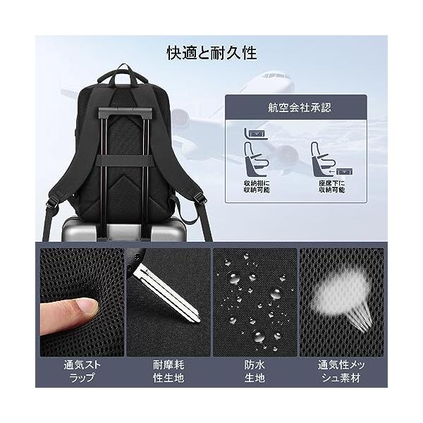 ・「大容量&軽量」リュックサイズは:48*32*15cm、重さ:565g。大容量のビジネスリュックのため、会社のパンフレット、水筒、折畳傘、15.6インチのPC、17.3インチのPC、衣服、雑誌、A4ファイル、財布、スマートフォン、教科書など、さまざまな物品を収納できます。またノートパソコンがすっきり入る内部のPCポケットには、リュック内外からの衝撃を抑えるクッション材が使用されています。通勤、通学、出張、旅行に欠かせないバッグパックです。