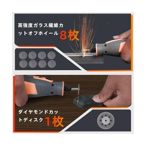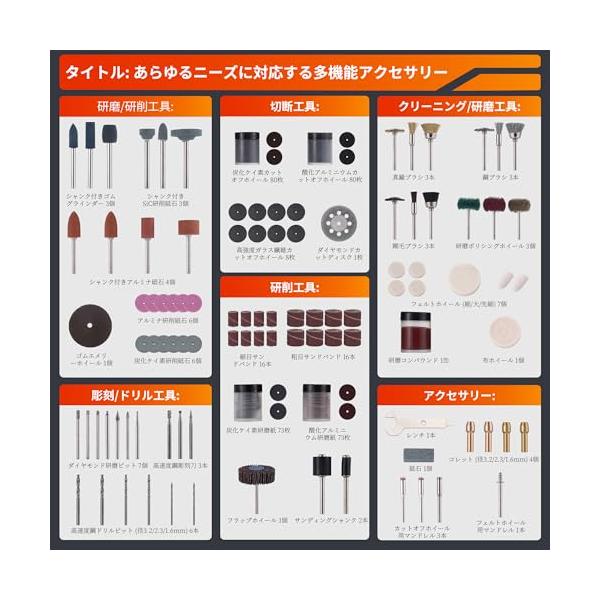 ・【420点セットで多様なニーズに対応】厳選された高品質な1/8インチ(3.2mm)軸のアクセサリー420点が付属し、切断ホイール、サンディングバンド、研磨ホイール&ニードル、HSSカッター、ブラシ、ドリルビット、フェルトホイールなど豊富に取り揃えています。木材、ガラス、タイル、プラスチック、金属など様々な素材に対応し、切断・研磨・削り・研ぎ・彫刻・穴あけ・磨き・クリーニングなど、幅広い用途にご使用いただけます。