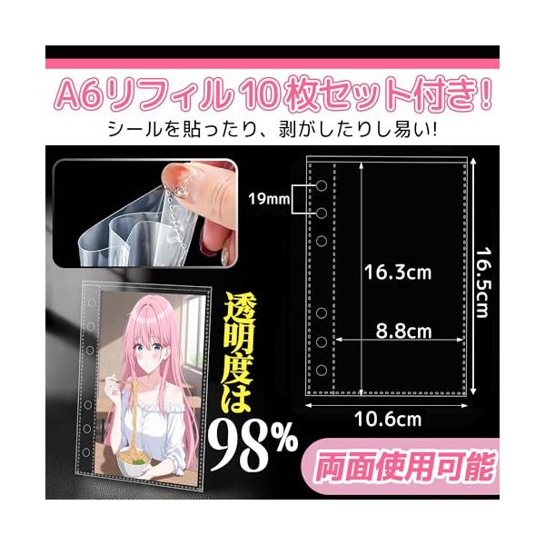・【高透明3層フィルムで美しく整理】A6サイズのシールバインダーに最適な、10.6cm×16.5cmの透明シール台紙を10枚セットご用意。3層構造の特殊フィルムが立体シールやカード、写真をしっかり固定。ほこりや汚れから大切なコレクションを保護し、美しく整理できます。はがせる設計でレイアウト自由自在。6穴仕様のクリアバインダーとして、女の子に人気の可愛いシール収納に最適です。色: 透明カバー。
